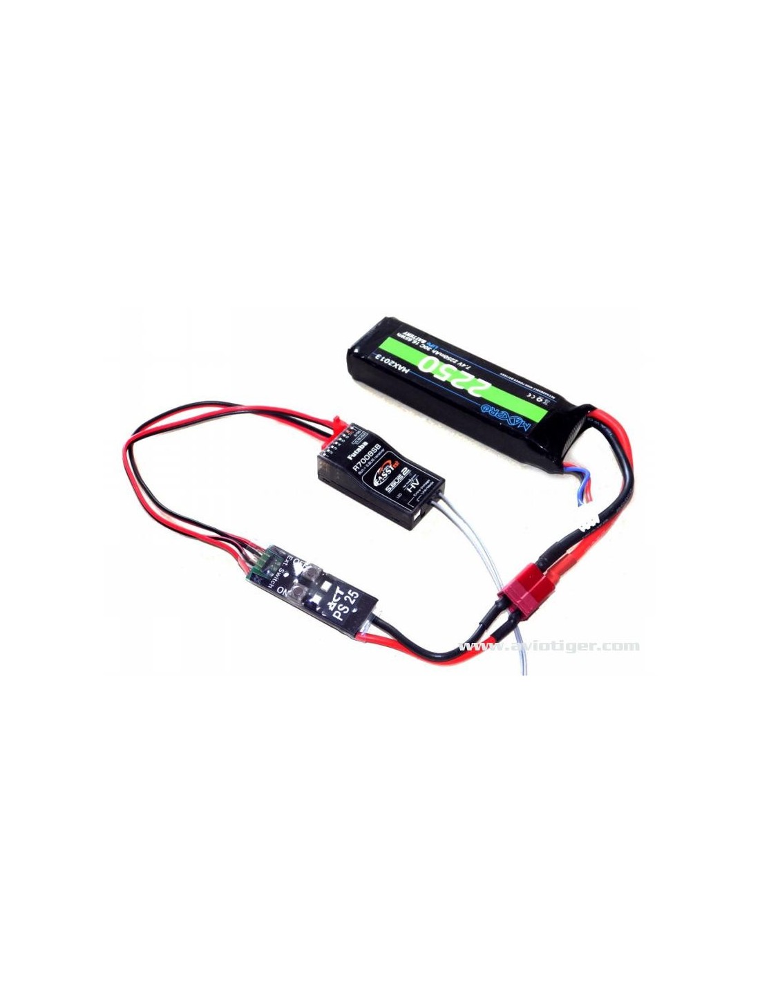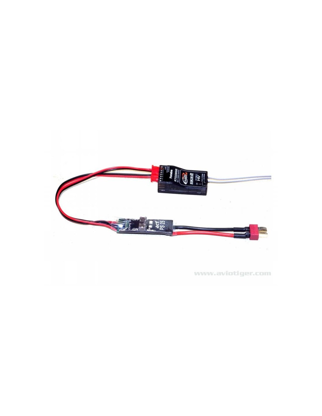 Le PS-25 utilise une prise en T éprouvé pour la connexion de la batterie, du côté du récepteur, il y a 2 câbles de prise Futaba d\'origine (prise de contact). Ces contacts spéciaux autorisent exclusivement des courants continus jusqu\'à 6 A, la valeur la plus élevée pour ce système de connecteurs. La section du câble est de 0,5 mm. Le conducteur négatif est en argent. Cela signifie que la pleine puissance du coupe-batterie ou de la batterie utilisée peut être transmise directement aux câbles d\'asservissement.